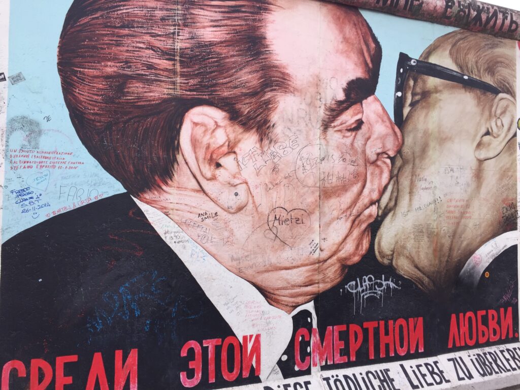 ベルリンの歴史を語る上で外せないのが、イーストサイドギャラリー。 1.3kmにわたって残るベルリンの壁には、世界中のアーティストによる平和へのメッセージが描かれている。中でも有名な「兄弟のキス(ゴルバチョフとホーネッカー)」の前は、やはり多くの人で賑わっていた。