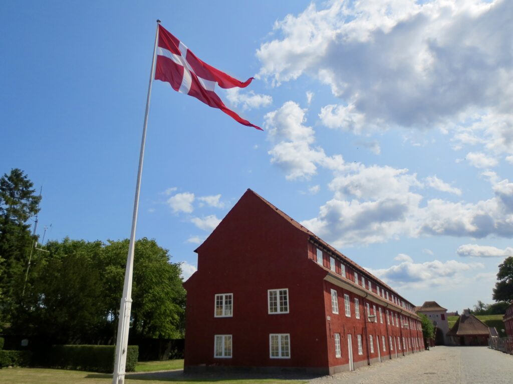 青い空に、世界最古の国旗と言われる赤と白の「ダンネブロ(デンマーク国旗)」がよく映える。