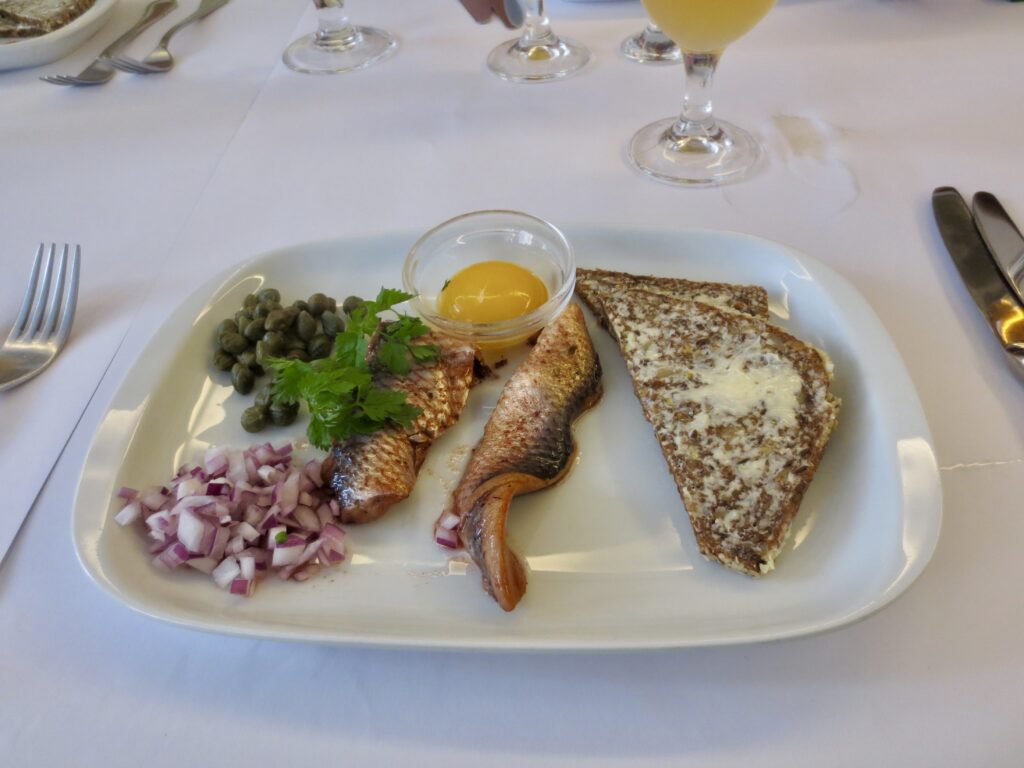 色んな種類がありますが、私は魚のスモーブローを注文し、ライ麦パンの上に、魚、玉ねぎ、ケーパーを乗せていただきました。 見た目も美しく、味も絶品。物価の高い北欧だけど、これは食べる価値がある。