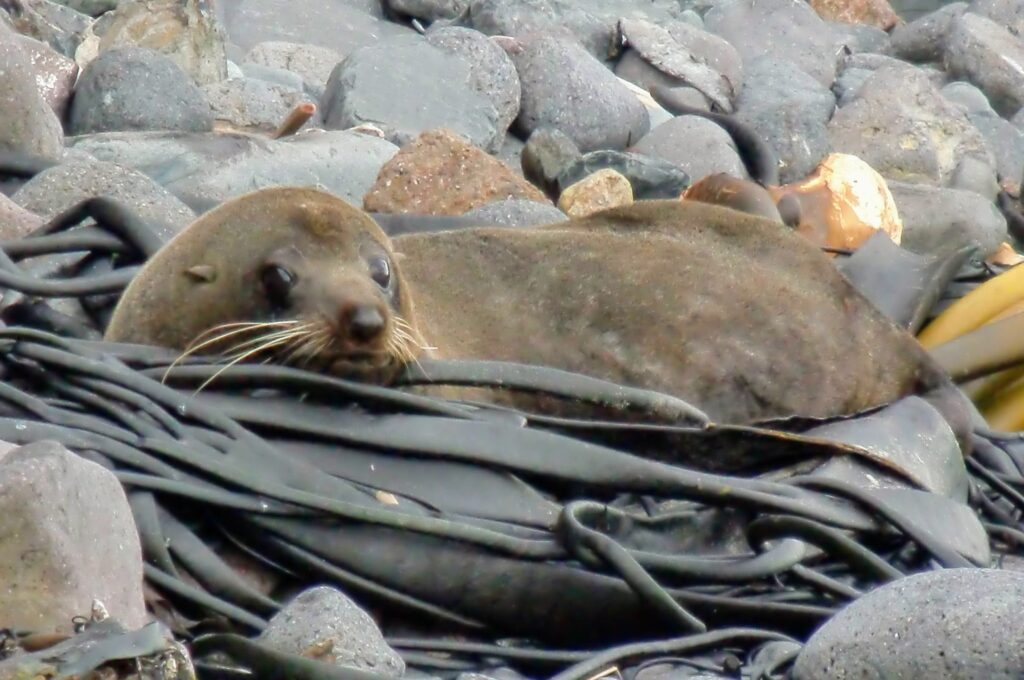 ペンギンを遠くから眺めていたら背後に大人しく野生のニュージーランド・オットセイが日向ぼっこをしていました。