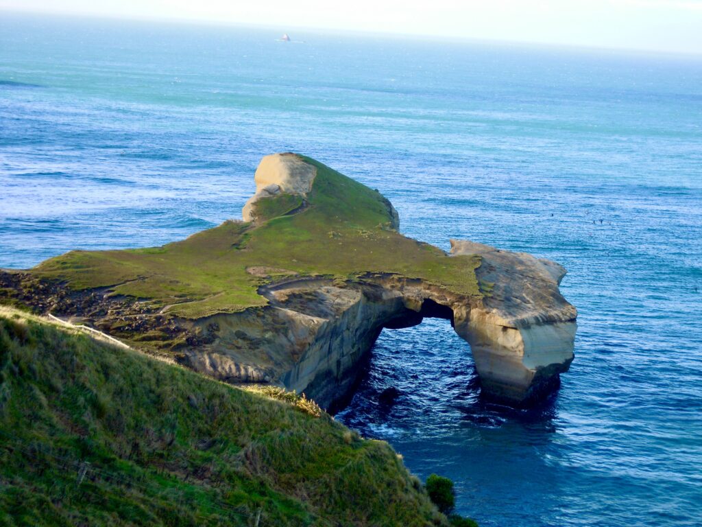 ダニーデンに来たら、絶対に外せないのがここです。 私有地を通らせてもらい、牧草地の中の急な坂道を下っていくと、海に突き出た巨大な奇岩が現れます。