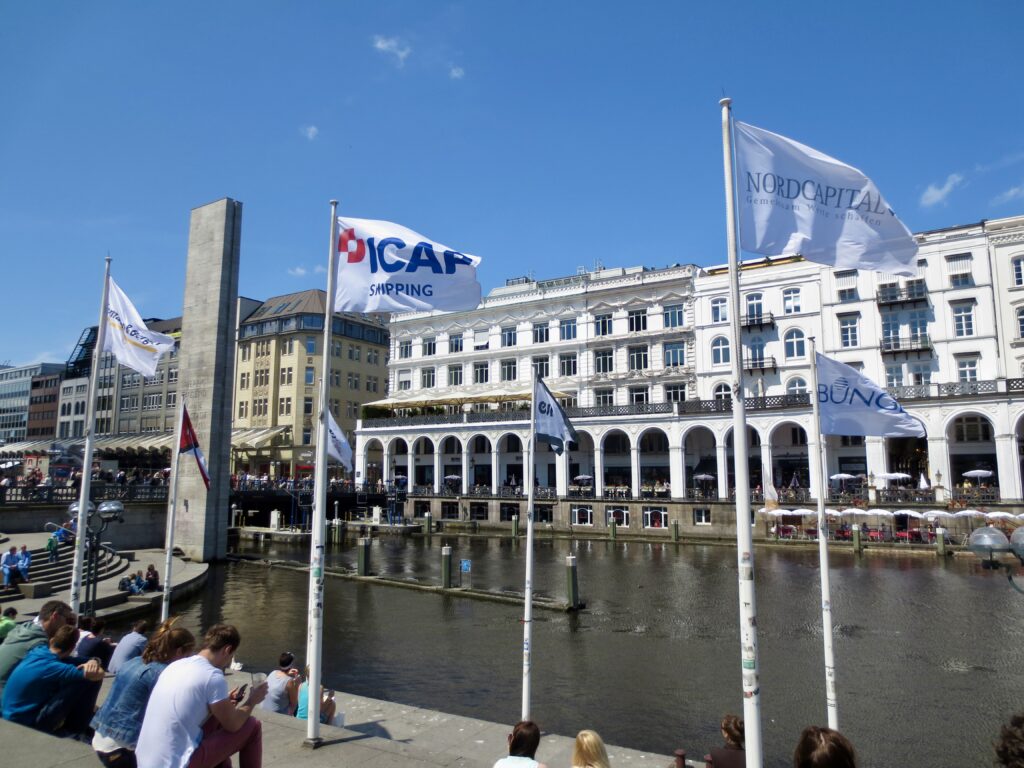 街の中心にある「アルスター湖」では、優雅にヨットに乗っている人たちがいます。 さっきまでの「鉄と油の匂いがする港」とは別世界。 この「優雅な水辺」もまた、ハンブルクの違った姿です。