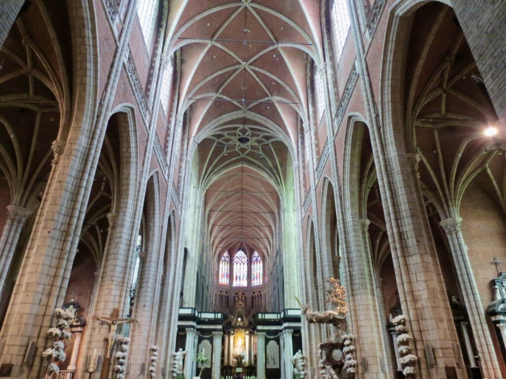 外観は少し煤けた石が歴史を語っていて、内部は天井がどこまでも高く、赤レンガの側壁とステンドグラスの光が響き合っている。
