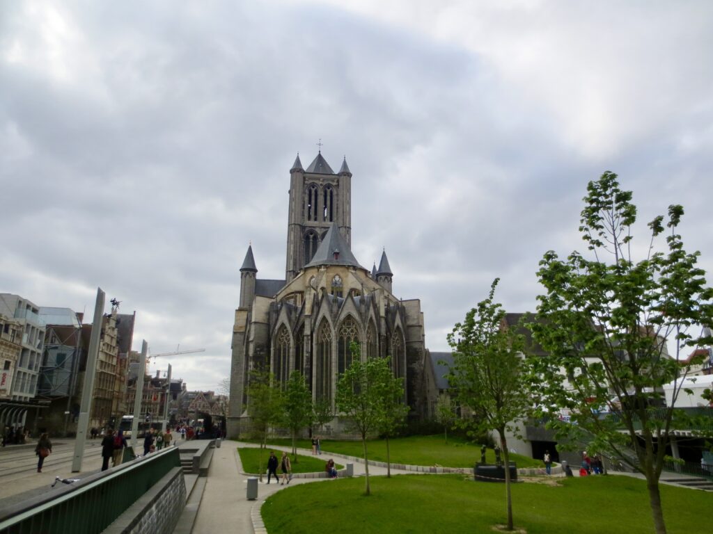 歴史ある教会なのに、広場の芝生やトラムが混ざり合って、どこか現代的にも見えるのがゲントらしいところ。実に良い。