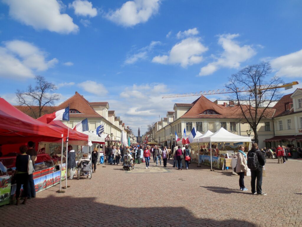 ドイツにいながらオランダの街並みを歩いているような不思議な感覚。 この日はちょうどマーケットが開かれていて、フランス国旗やテントが立ち並び、地元の人々で賑わっていました。ベルリンの尖った空気とは違う、どこか穏やかで温かい時間が流れています。