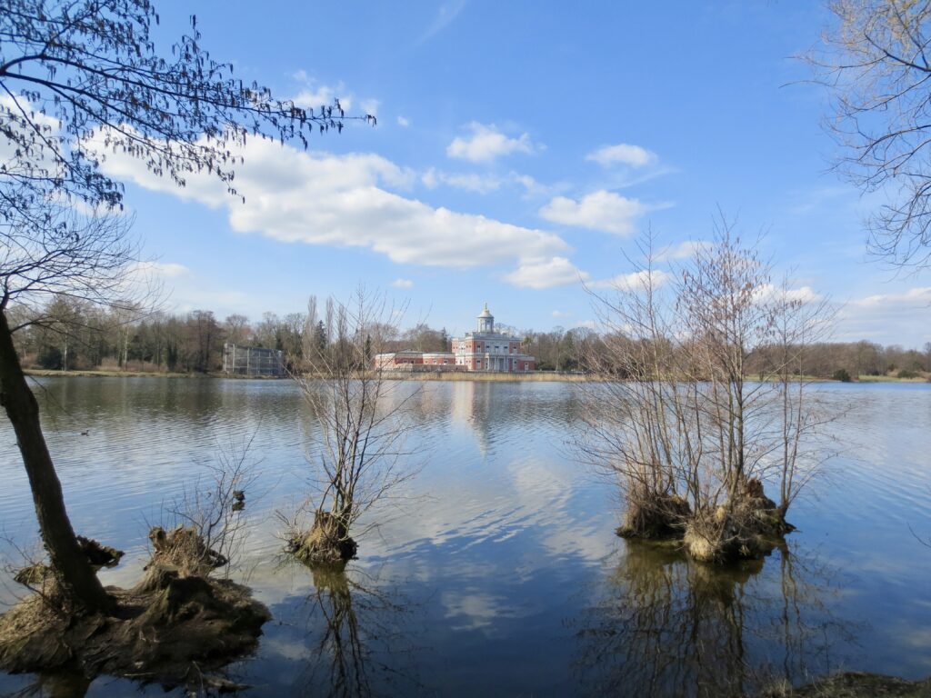 ハイリガー湖(Heiliger See)のほとりに佇むその姿は、水面に映り込んで絵画のよう。サンスーシほど観光客も多くなく、静かに建築美を堪能できる穴場スポット。