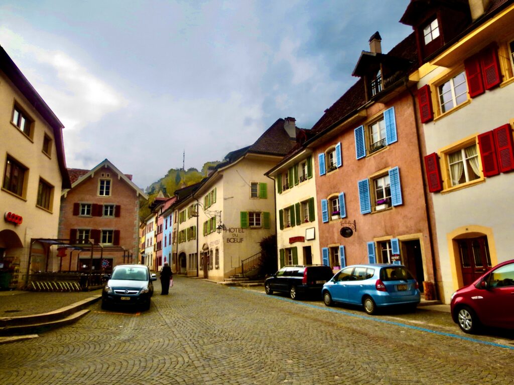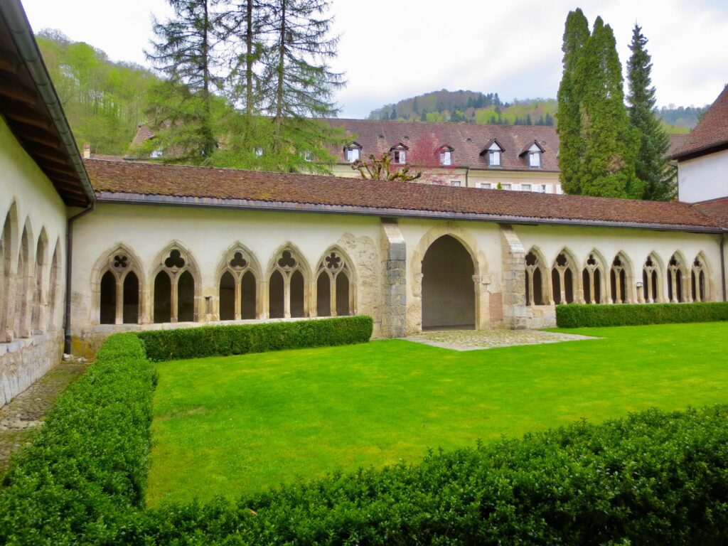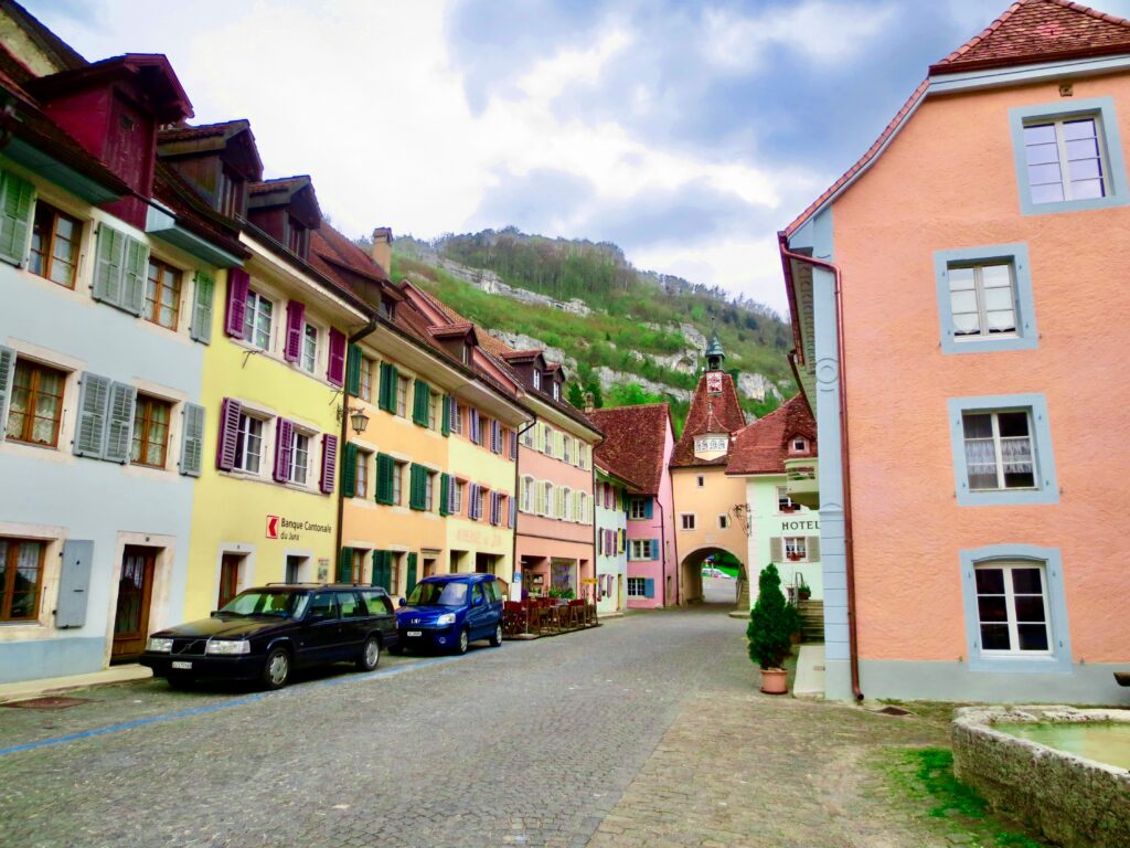 街の中心にある コレジアート教会 は、12〜13世紀の建築がそのまま残るSt‑Ursanne最大の見どころ。教会前の並木道も綺麗で、時間がゆっくりと流れています。